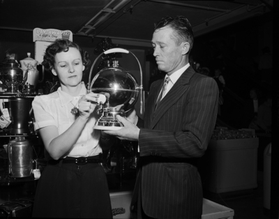 J. A. Mercer, 2611 McKinley, doing his Christmas shopping early, is shown as he watched a clerk, Mrs. Ruby Bagley, 5311 Cornell, demonstrate a shiny coffee maker.