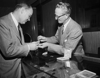 Fred Harvey, 4738 El Campo, left, is shown looking over diamonds that may be a Christmas gift for someone. The salesman is W. Louis Hamilton, 3516 Suffolk Dr. Early Yule buyers here were thronging retail stores of all kinds.