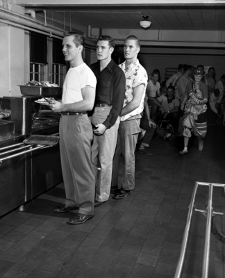 Texas Christian University's three tailbacks-all physically ready for game with Texas-line up for dinner after practice session. Left to right are Gilbert Bartosh, Danny Ray McKown, and Malvin Fowler. Published in Fort Worth Star-Telegram morning edition November 14, 1951.