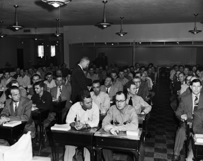 Post office Inspector L. H. Powell answers questions before an examination for postal personnel desiring to qualify for inclusion on roster from which future vacancies as clerks-in-charge will be filled. In the foreground are T. F. Underwood of 4333 Strong and J. C. of 2927 Princeton.