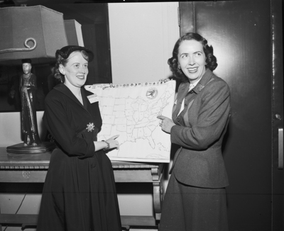 Miss Martha Anne Woodrum of Roanoke, Virginia, right, convention chairman for the National Aviation Trades Association in session at Hotel Texas and an association vice president, points to the area from which she and Miss Evelyn Waters of Washington, secretary of the National Air Taxi Conference, flew to attend the four-day meeting. Miss Waters designated Fort Worth's location. Two woman standing on right and left side smiling holding up a map.