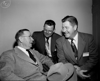 Gathered around for a moment of shop talk at the National Aviation Trades Association (NATA) annual convention at Hotel Texas were, left to right, Charles O'Connor of Albany, New York, NATA's New York State member-at-large; H. L. Smith of Albemarle, N. C., president of the North Carolina chapter of NATA, and Clay Swaim of Salisbury, North Carolina, vice president for NATA's Region 2.