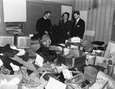 A good start on the first carload of clothes, food and garden tools for Koenigshofen, Bavaria, had been made by Arlington citizens who adopted the Bavarian border town of 5000. Taking a close look at contributions in Arlington are, left to right, Reverend Donald L. Rhaesa; Miss Rosalyn Zitney and Mayor Tommy Vandergriff.