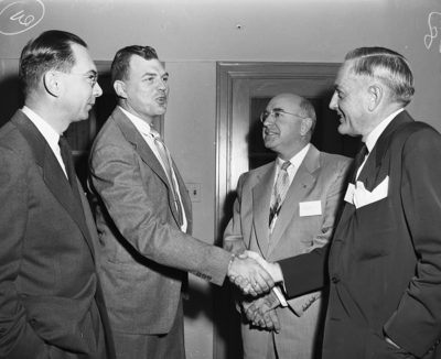 Series on West Texas Chamber of Commerce 34th convention at Amarillo. Left to right, J. C. Hunter, Abilene Chamber of Commerce president; Jim Willson Jr., Floydada; Hal Dyer, Denton Chamber of Commerce president, and Holford Russell, Denton, WTCC vice president.