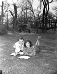 With spring in the air, studying is hard for Joyce Hinds and Robert Reeves as they relax on their campus at North Texas State College in Denton. She is the sister of Miss Carolyn Hinds, 1407 Joplin, and he is the son of Mr. and Mrs. George E. Reeves, 2007 Tierney Road.