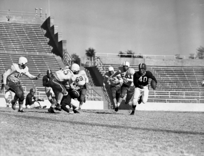 Wogs' Ronald Clinkscale picks up 16 yards as Texas Freshmen's Billy Harris trails. Published in Fort Worth Star-Telegram evening edition November 16, 1951.