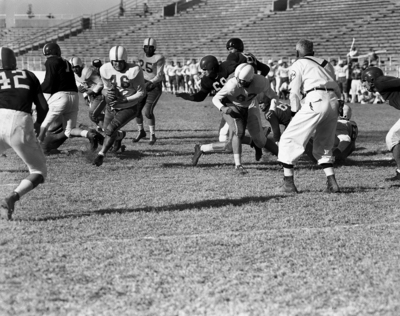 Billy Quinn, Texas freshman halfback, finds a big hole as he goes for seven yards and a touchdown against the Texas Christian University Wogs in the second period at Amon Carter Stadium. In background is Dick Miller (25). who made handoff. Others are Wayne Delaney (87), Texas, and Rex Lindley (69). Published in Fort Worth Star-Telegram morning edition November 16, 1951.