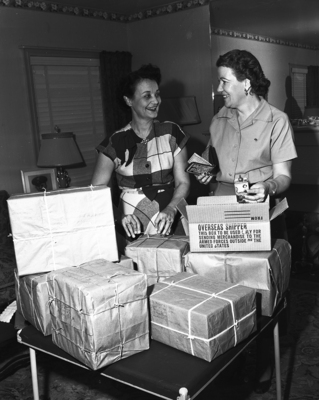 Mrs. Irene Weatherby of 2213 Bladin, left, president of Fort Worth Gold Star Mothers, and Mrs. Virginia Knight of 4113 Locke, treasurer of the organization, pack Christmas packages to send to servicemen overseas. The project is a nation wide program of Gold Star Mothers.
