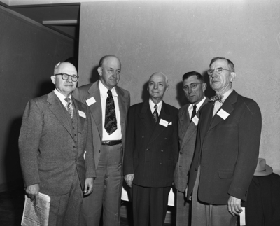 Five former presidents of the West Texas Chamber of Commerce found time to reminisce briefly at the WTCC convention in Amarillo. Left to right, they are, H. S. Hilburn of Plainview, J. S. Bridwell of Wichita Falls, E. W. Hardin of Amarillo, H. Y. Overstreet of Farwell, and J. M. Wilson of Floydada.