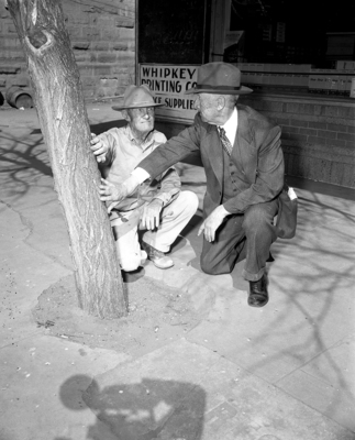 Laid in 1908 and daringly guaranteed for five years by Green Delaney, left, said to be oldest, Mitchel County continuous resident, is shown to another old-timer, J. W. Shepperd, Colorado City resident since 1882.