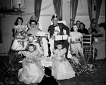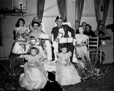 Miss Elizabeth Harkcom is shown after being crowned queen of South Side Rebekah Lodge 49. Harvey Ferguson was named king. The queen's attendants are, left to right, Nita Jean Cheek, Judy Kaye Ferguson, Sandra Kay Johnson and Betty Ruth Piland. Ferguson and Miss Harkcom were honored because they obtained the largest amount of contribution for the lodge's welfare work.