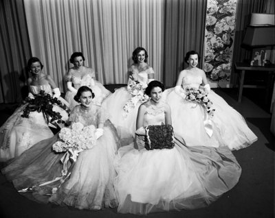 The 1951 debutantes of the Steeplechase Club and The Assembly, shown at the Steeplechase Ball at River Crest Country Club holding flowers in ball gowns, are, left to right, seated foreground, Miss Mary Lynne Mulky of Oklahoma City, and her cousin, Miss Betty Beavers, Assembly debutantes; and, back row, Misses Joan Hutchens, Mary Ann Ransom of Mexico City, Anseth Helen Teel, and Frances Hackney, Steeplechase debutantes.