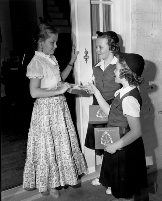 Image shows Janet Ticknor, a young girl dressed like housewife, buys candy from Frances Ann Hawley, center, and Carolyn Benton who are Camp Fire girls.