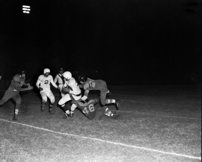 Arlington Heights players Warren Neal (46) and Lloyd Jary bring down Paschal's Boddy Hughes after a 1-yard gain in the second quarter of the football game at Farrington Field. Published in Fort Worth Star-Telegram morning edition November 17, 1951.