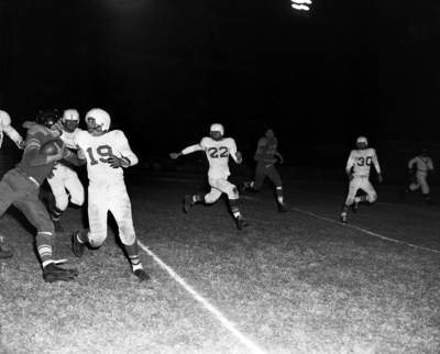 Arlington Heights' Buzz Kemble skips for 11 yards as Paschal's Gaines Godfrey (19) moves in. Kemble amassed 233 yards rushing, 86 passing for 319 total offense as Jackets won, 34-19. Published in Fort Worth Star-Telegram evening edition November 17, 1951.