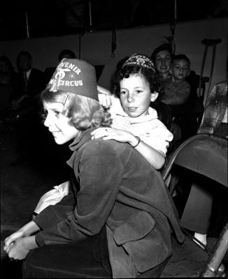 Peggy Climer, left, leans forward as Celia Drosihn puts her hand on Climer's back. Both girls are seen wearing Shriner hats titled, "Souvenir Shrine Circus".