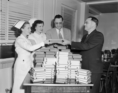 W. H. Agee, right, vice president of the Fort Worth Gideons presents Bibles to City County Hospital Nurses Daisy Lucariello, left, and Bettye Reese. At center, Lowell Hudson, hospital administrator, looks on.