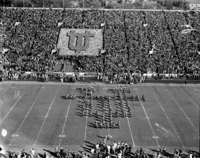 University of Texas students do one of their card tricks between half-time at an Austin game. The stadium is filled with a large crowd as students form the letters 'UT' on the field.