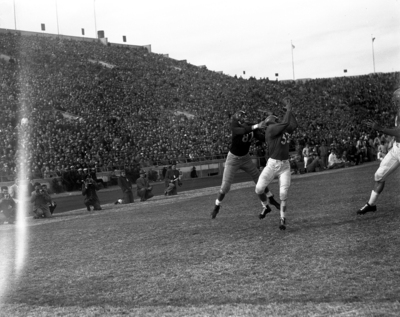Don Menasco, Texas end, leaps to intercept a pass intended for Bob Blair, Texas Christian University end, on the goal. A penalty wiped out play. Published in Fort Worth Star-Telegram morning edition November 21, 1951.
