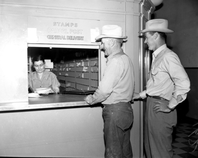 Carl Brunken and Lloyd Morgan is standing at Stamps parcel post general delivery kiosk. Maggie Burkett is sitting inside the kiosk and talking to them.