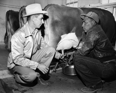 Image from a series on the Roy Moritz Dairy Farm in Jones County published in the Fort Worth Star-Telegram's Ranch and Farm News. The Image shows Roy Moritz, a Jones County dairyman, talking with his herdsman, Julian Chabarria. Published in the morning edition, January 21, 1951.