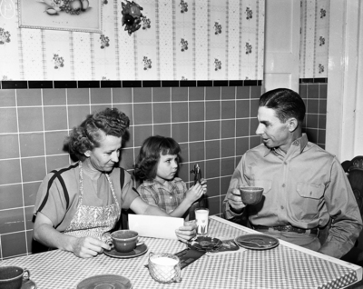 Image from a series on the Roy Moritz Dairy Farm in Jones County published in the Fort Worth Star-Telegram's Ranch and Farm News. The Image shows Mr. and Mrs. Roy Moritz, with their daughter, Judy. Published in the morning edition, January 21, 1951.
