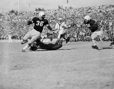 Bob Smith, the Texas Aggies' big fullback who will be ready to go against the Frogs, evades a tackler in the Rice game of last season. Published in Fort Worth Star-Telegram morning edition October 18, 1951.