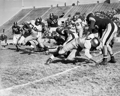 Carswell Fullback Jim Jeffrey (30) goes for six yards against Fort Sam Houston as Rangers' Ken Shobe (35) and Gerald Weatherly (45) trail. Jeffrey scored twice. Bombers won, 55-14. Published in Fort Worth Star-Telegram morning edition November 19, 1951.
