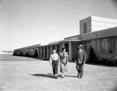 Raby Jeans Hamilton, Mrs. Thomas D. Hamilton and J. B. Youngblood. They are walking together outside of a building.