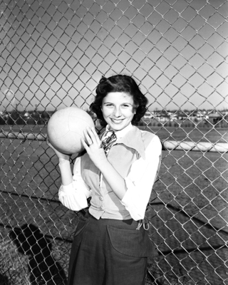 Frieda Weisblatt, 14-year-old Polish girl, is seen holding a basketball, who came to America, is adapting herself to American life, including its sports. Frieda recently was elected vice president of her seventh grade class at McLean Junior High School. Her adopted parents are Mr. and Mrs. Jake Weisblatt of 1225 Clary.