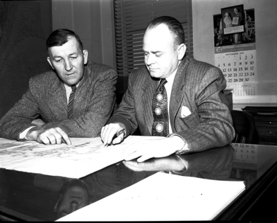Russell Farmer, left, promoted to division consulting geologist, checks a map with his successor, Thomas A. Hendricks, as division geologist for the North Texas-New Mexico division for the Stanolind Oil & Gas Company in Fort Worth.