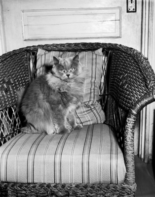 Image shows Texas Martina, a blue Persian cat owned by Mrs. Walter Nelson sitting on a chair.