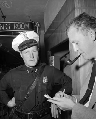Clipping reads: "Fort Worth [residents] were asked what they hope they'll have to be thankful for by Thanksgiving of 1952...A policeman was thinking of everyday groceries. Traffic Patrolman L. K. Gray will be thankful, he said, for 'a better salary for the entire department.''" Photo shows a male police officer in uniform facing forward with his arms on his hips. Unidentified man [presumably the reporter George Dolan] is facing sideways with a pipe in his mouth writing on paper.