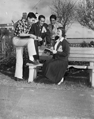 Cheerleader Betty Barwise holds small pre-game pep rally for tackles Jim Pruitt and Bob Wilkes and end Loyd Jary, left to right, of Arlington Heights High School football team before title game with Polytechnic High School. The girl is wearing a lettered sweater and a skirt. Bob Wilkes is wearing a lettered jacket.