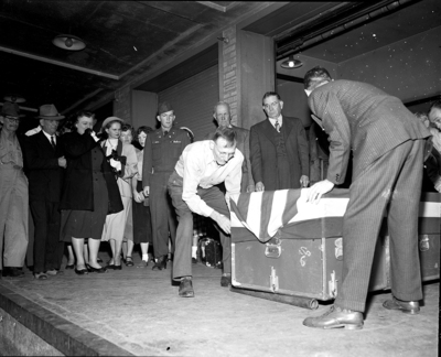 Mr. and Mrs. William Jack Plott (far left in black), 5120 Byers, watch as the casket carrying the body of their son, Corporal William Plott Jr., is rolled toward a hearse at the T&P Station. In uniform is Private Jimmy Lee Plott, who escorted his brother's body from Korea. Behind Jimmy Lee is one of his sisters, Janice, 15.