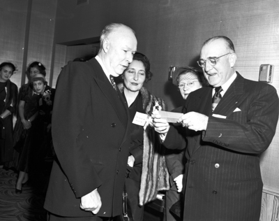 Four loyal football fans discuss Texas Christian and Rice University game, with friendly differences of opinion on the outcome. Texas Christian University (TCU) president M. E. Sadler, right, presents Rice President W. V. Houston tickets to the game. Looking on are Mrs. Houston, second from left, and Mrs. Sadler. The four were guests at a dinner of Rice alumni.