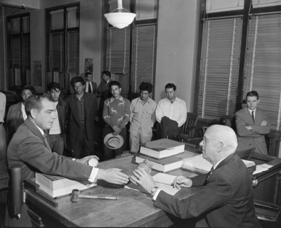 Peace Justice H. N. Newman, seated at right, is inspecting evidence handed to him by District Attorney Alvin B. Haley in the arraignment at Wichita Falls of 10 persons in a marijuana case involving high school students there. Five of the defendants, looking on, are, left to right, Alfredo Ramos, Rodolfo Ramos, Bennie Rangel and Raul Villolobos, all of Wichita Falls, and Mike Mendez of Fort Worth.