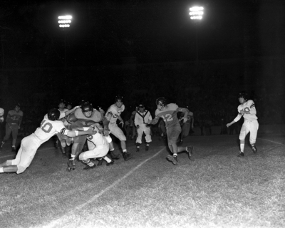 Buzz Kemble, Arlington Heights halfback, is shackled by two Poly players at the end of a six-yard run in the first period at Farrington Field. At left is Paul Wilson (40), while Bob Baldwin has Buzz at the waist. At right is Donald Decker (53). Kemble ran 71 and 73 yards for scores. Published in Fort Worth Star-Telegram morning edition November 24, 1951.