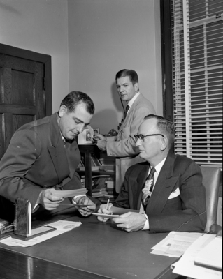 District Attorney Alan B. Haley, left, confers with O. T. Freeman, high school principal, in the investigation of marijuana "reefer" smoking among Wichita Falls high school students. Standing is George Anderson Jr., assistant district attorney, also working in the investigation.