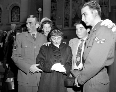 At funeral services at Wichita Falls was the family of 12-year-old cancer victim, Nancy Voss. Left to right are Nancy's father, Staff Sargeant Malcolm Voss; mother, and brothers, Bradford W. Voss and Sergeant Barry H. Voss, stationed at Colorado Springs, Colorado.