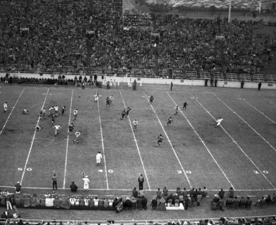 The Frogs' Ray McKown hurls for the first Texas Christian University touchdown against Rice at Amon Carter Stadium. Bob Blair, an end, is the receiver. Note how he is threading through three deep Owl defenders to reach a clear spot for the catch. The play is the first one in the second quarter. Texas Christian University won, 22-6. Published in Fort Worth Star-Telegram morning edition November 25, 1951.