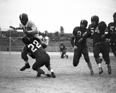 Gene Silver (22) of the Owls bring down the Frogs' Johnny Medanich with an open tackle to end a pass play that gained 17 yards in second period. Published in Fort Worth Star-Telegram morning edition November 25, 1951.