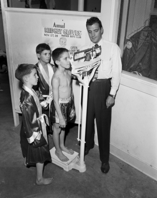 Cleddie Keith, left, chiggerweight of the last year who has grown into a flea weight, watches Physical Director Fred Daring of the Panther Boys Club weigh in David Livingston. Lad behind Livingston is Roger (Rocky) Shelton, flea weight of last year who'll compete as a spider weight in this year's Midget Gloves tournament. Published in Fort Worth Star-Telegram evening edition November 26, 1951.