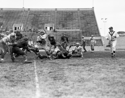 Leo Dubois, Bomber halfback, drives into the Savage line for a three-yard gain at Farrington Field. Southeastern Guard Tommy Langham (not shown) made the stop. Another Savage trails Leo. Bombers won, 61-0. Published in Fort Worth Star-Telegram morning edition November 26, 1951.