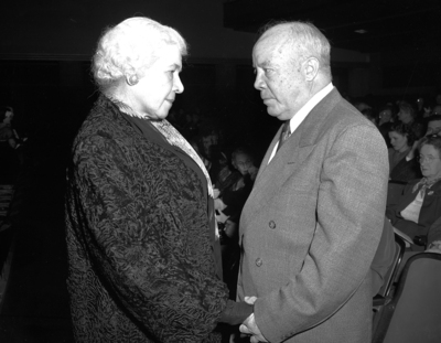 Image shows Mrs. Eva Brown of New York, singer, voice coach and former Fort Worth resident, holding hands facing her old friend, W. J. Marsh, composer and organist.
