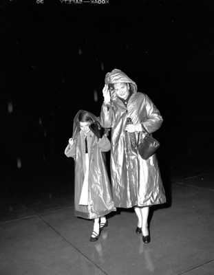 Image shows Mrs. J. I. Jackson and daughter, Susan, wearing slickers over their dress-up clothes were among early arrivals to the Will Rogers Stadiums.