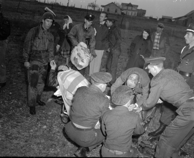 Technician Sergeant Charles A. Kartochvil, aerial gunner, is loaded in an ambulance after parachuting from a disabled B-36. He sustained a possible fracture of the leg when he landed and is seen on a gurney surrounded by other military officers.