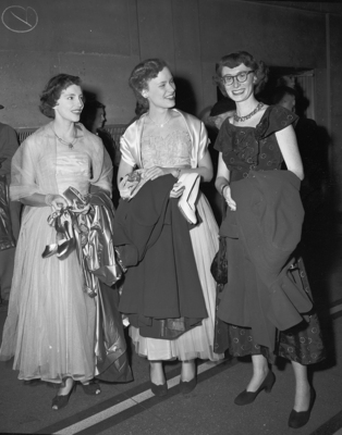 Left to right, Martha Jones, Marian Armstrong, and Louise Deaigh are pictured holding their coats and smiling.
