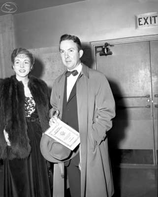 Image shows Joyce Childrens, left in a fur coat and Pete Oliver in a tuxedo next to her.