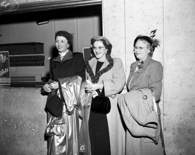 Image shows Mrs. J. Herman Thomas, Mrs. J. P. Rhodes and Earna Banner holding their coats and smiling.